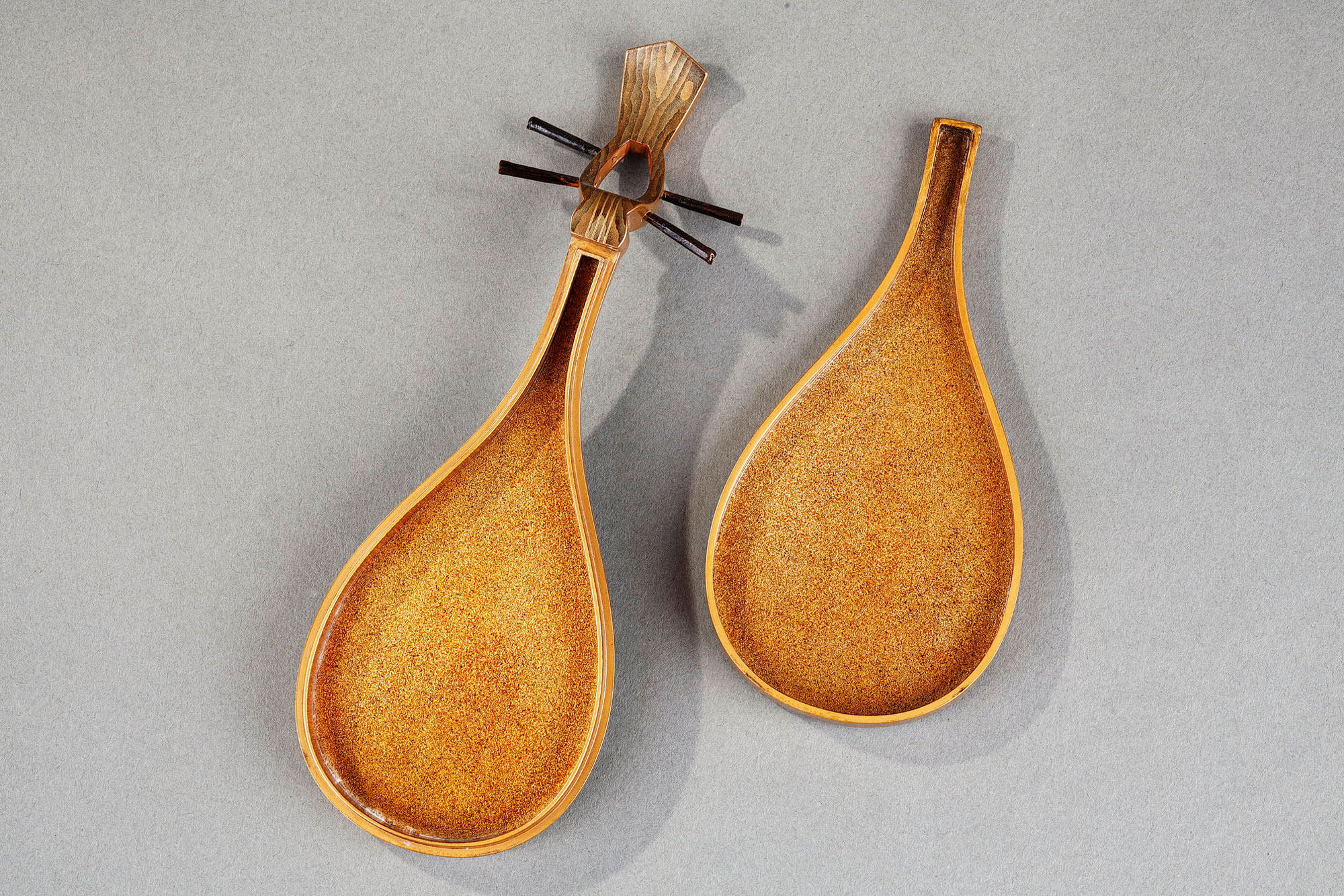 Cette boîte, délicatement façonnée en forme de biwa, présente une silhouette élégante qui rappelle l’instrument traditionnel japonais. Le décor en surface est réalisé par un effet faux bois en trompe-l’œil, avec des cordes également suggérées en trompe-l’œil. La surface est également ornée d’une bande représentant un motif de poissons dans l’eau exécutés en maki-e or, créant ainsi des jeux de textures et de reflets sur l’instrument. L’intérieur et le dessous de la boîte sont traités en laque nashi-ji (fond aventurine), tandis que les côtés sont réalisés en kin-fundame (fond or). L’ensemble met en valeur un travail de laque précis et décoratif, combinant différentes techniques traditionnelles.