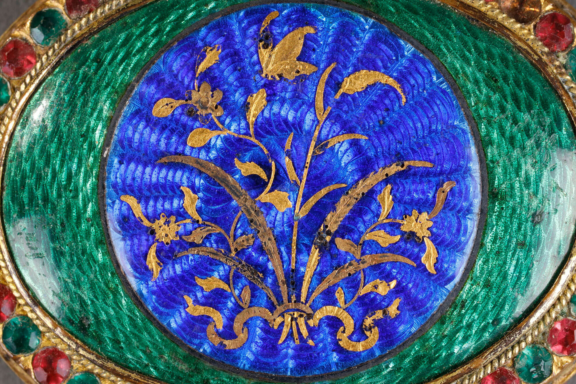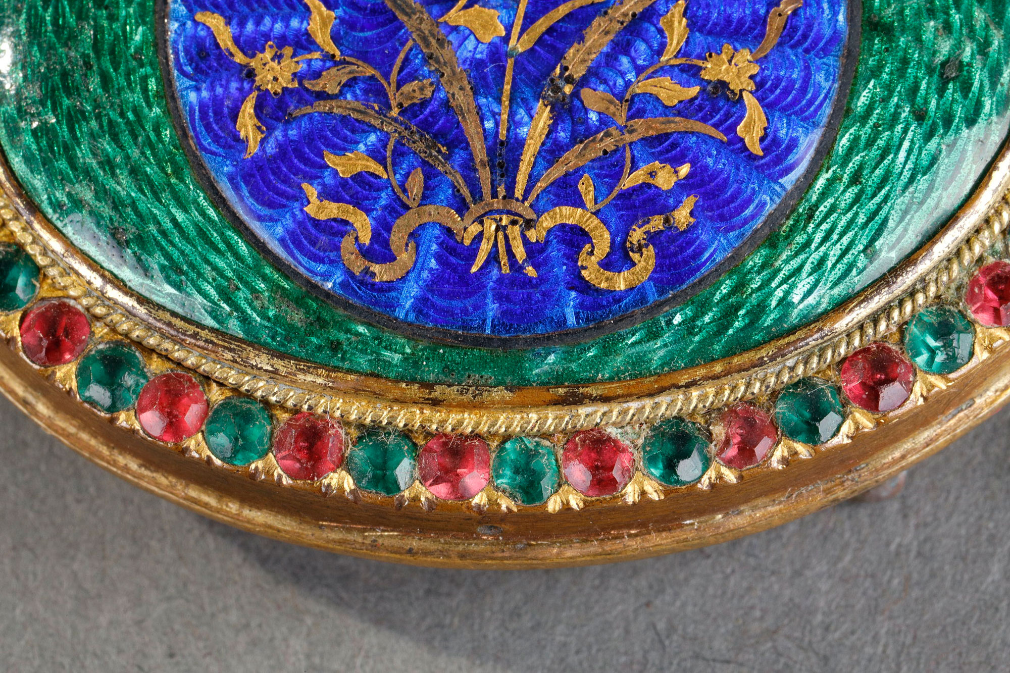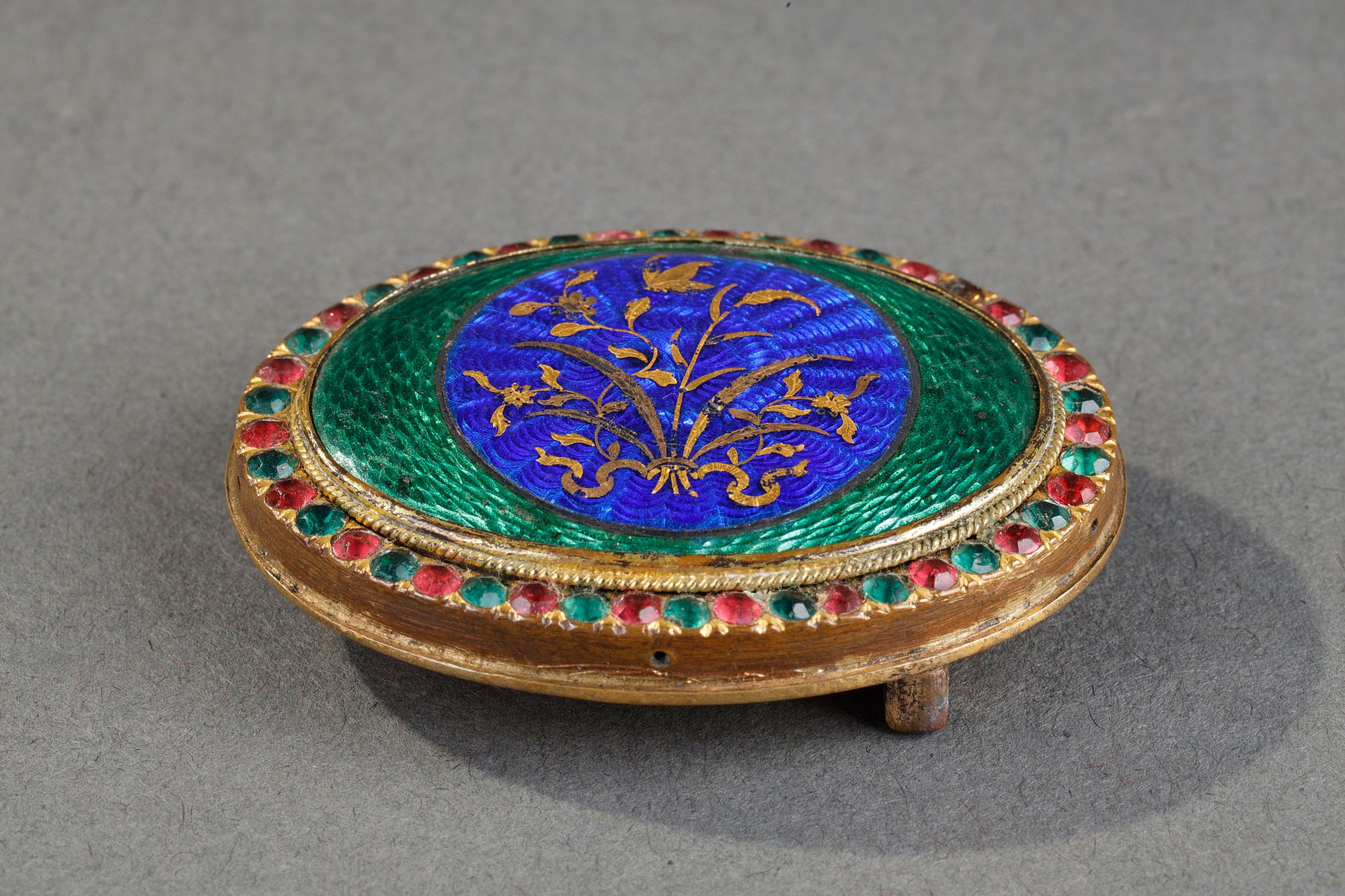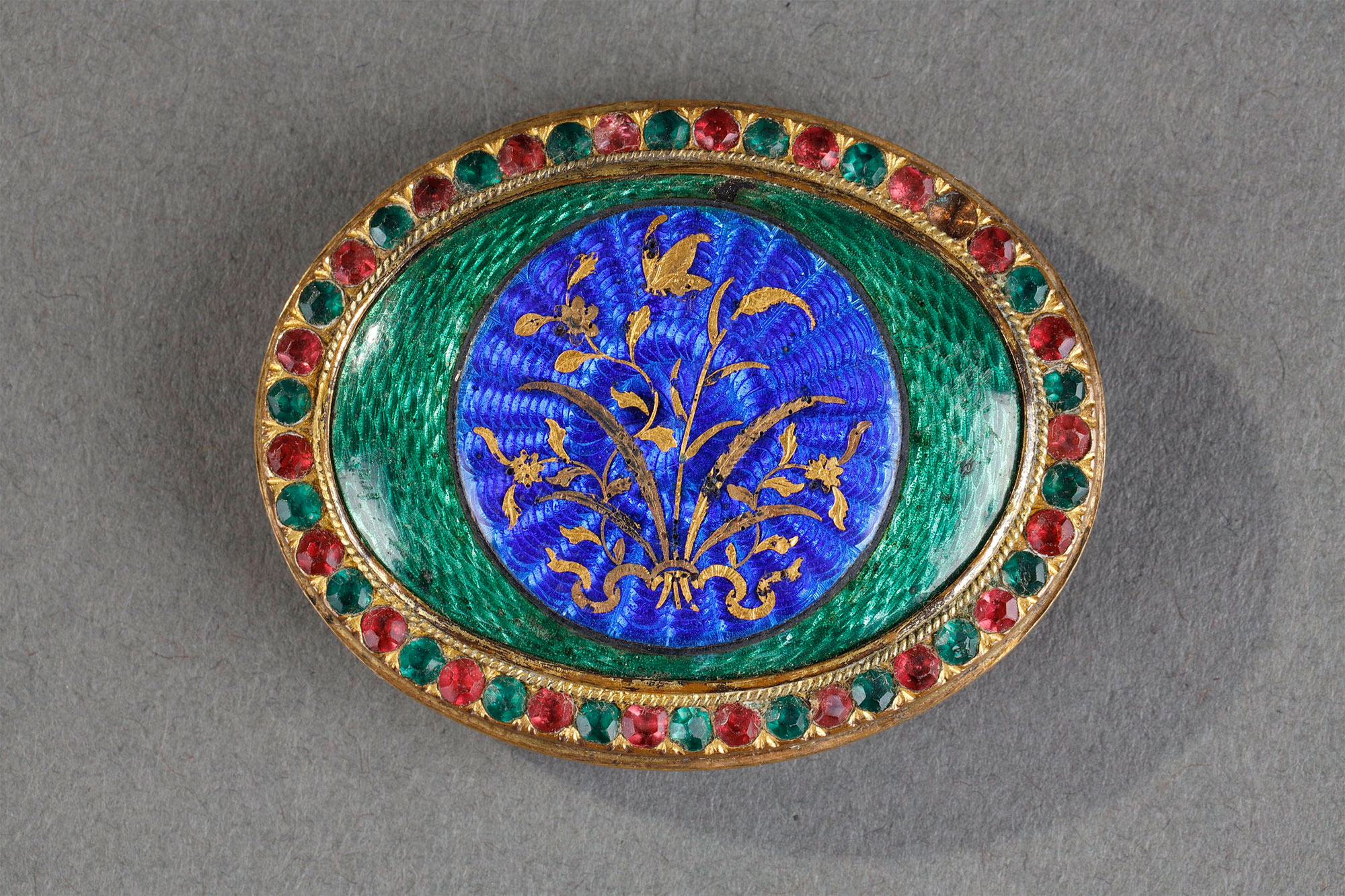 Boucle de ceinture en émaux de basse-taille, décoré d’un bouquet de fleurs de feuilles d’or et entouré de pierres semi-précieuses. Tribut du Guangdong.