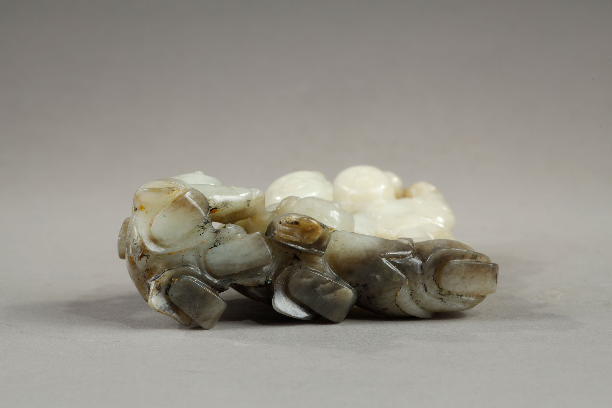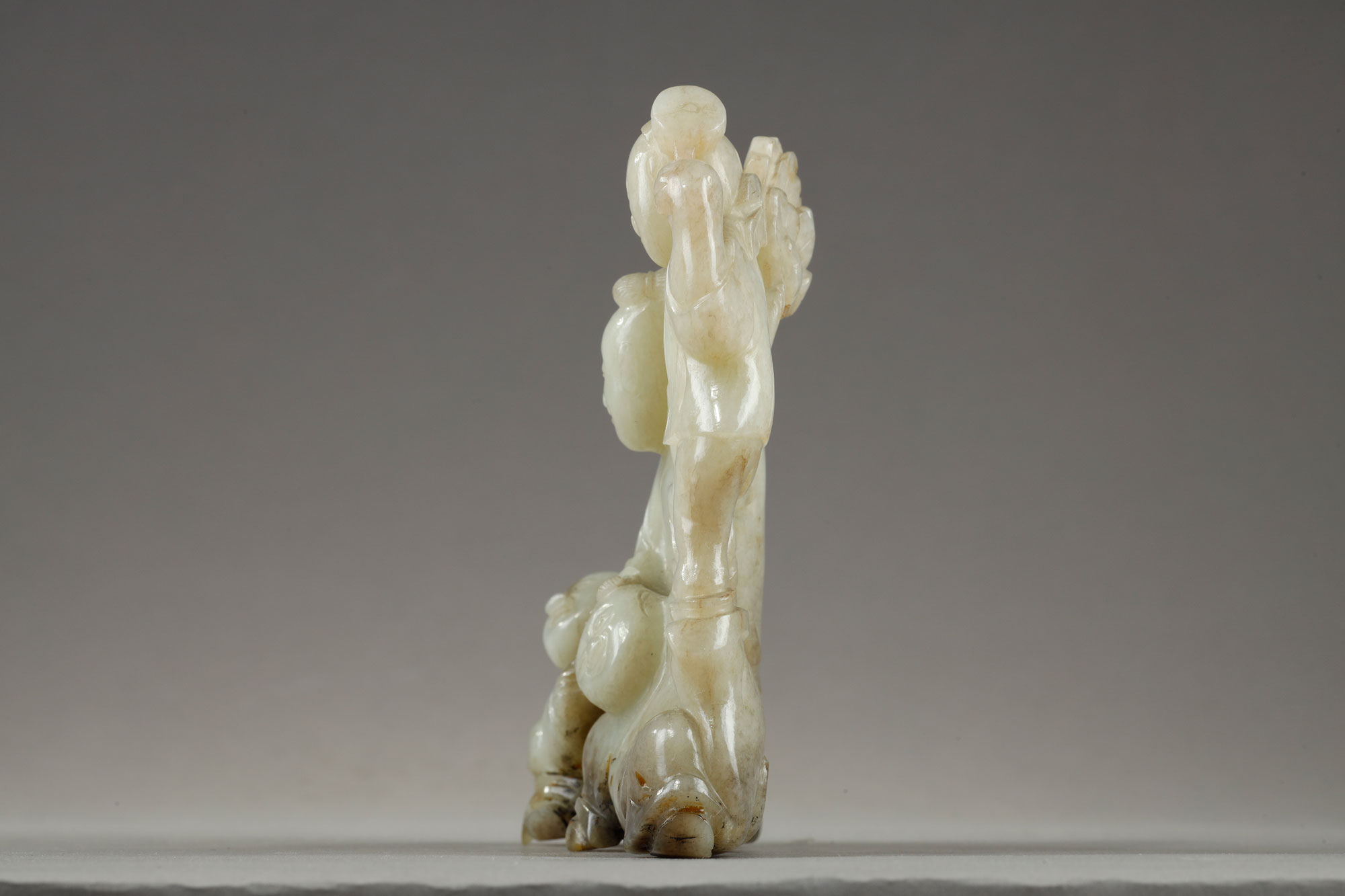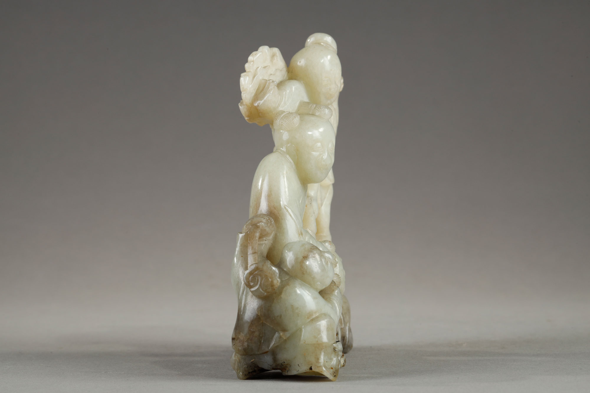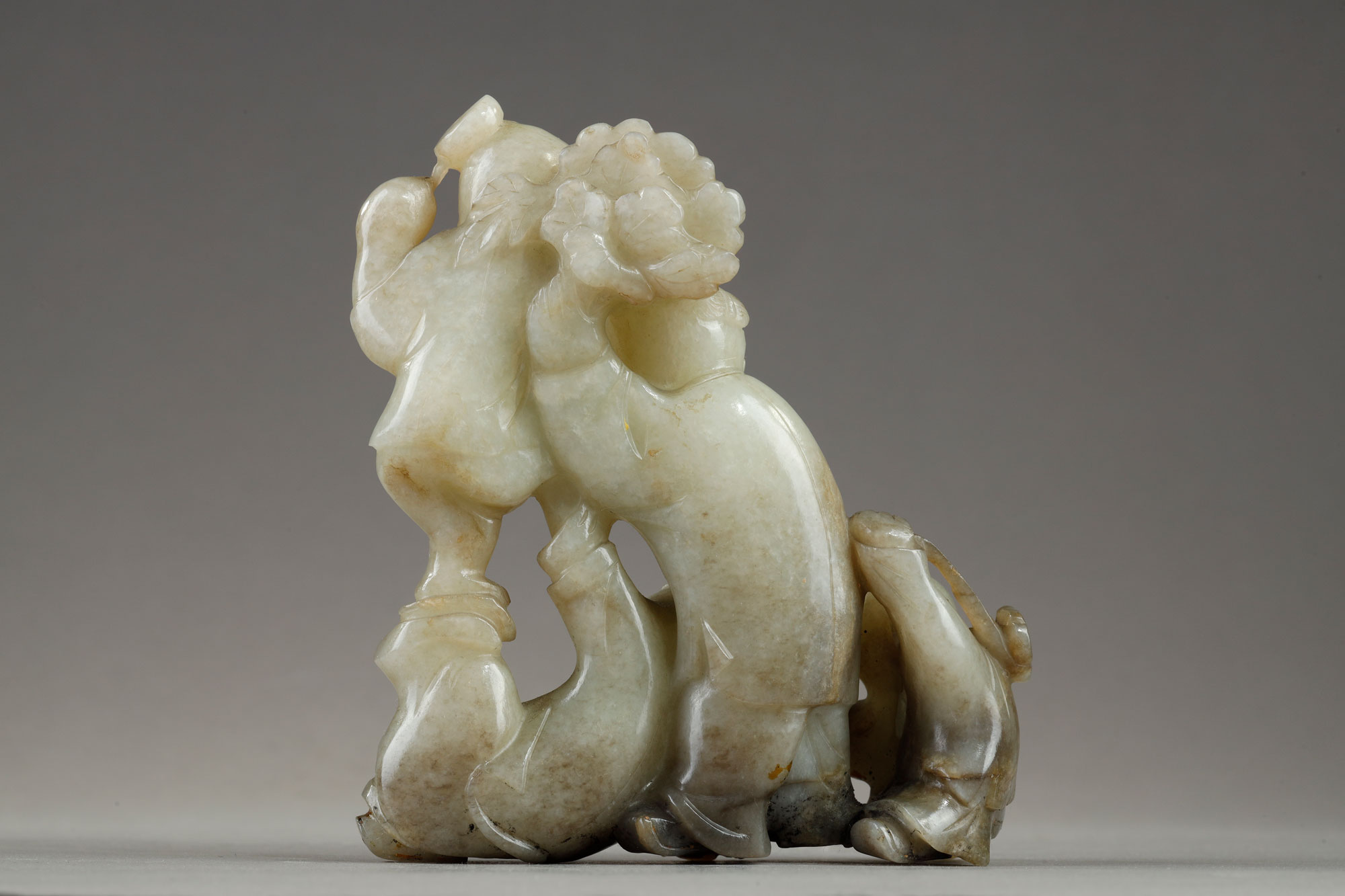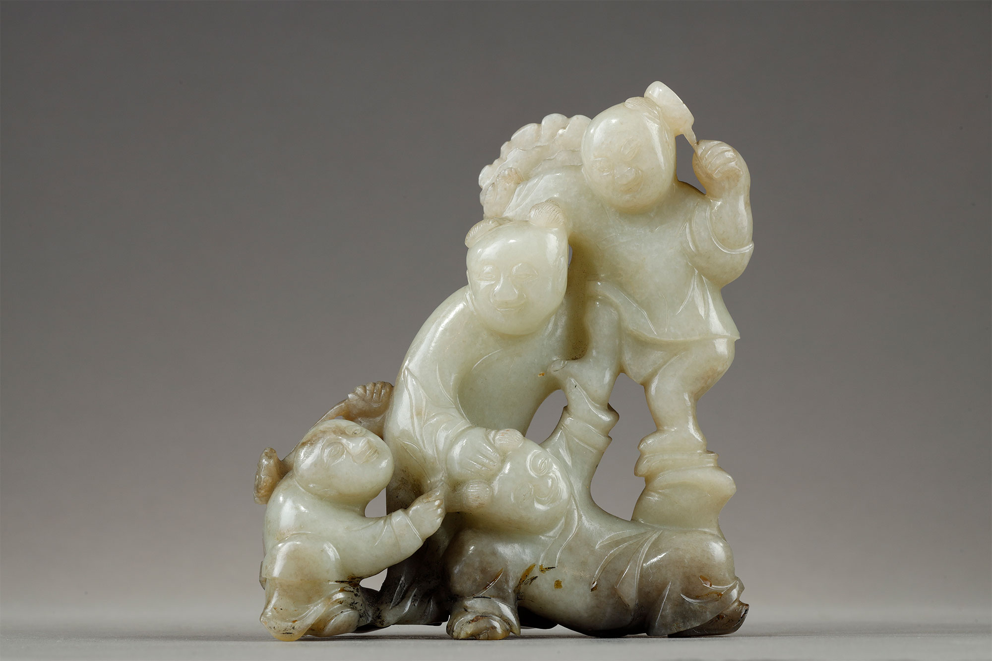 Unusual group in white and grey nephrite jade, depicting four figures with smiling faces in a lively scene. Two of them are standing: one is carrying a bouquet of flowers, while the other is raising his left arm, holding an object, possibly an instrument, while standing on a reclining figure. The fourth, crouching, is holding a ruyi in his hands. Three of the figures have their hair tied back and all are dressed in long, finely carved robes.