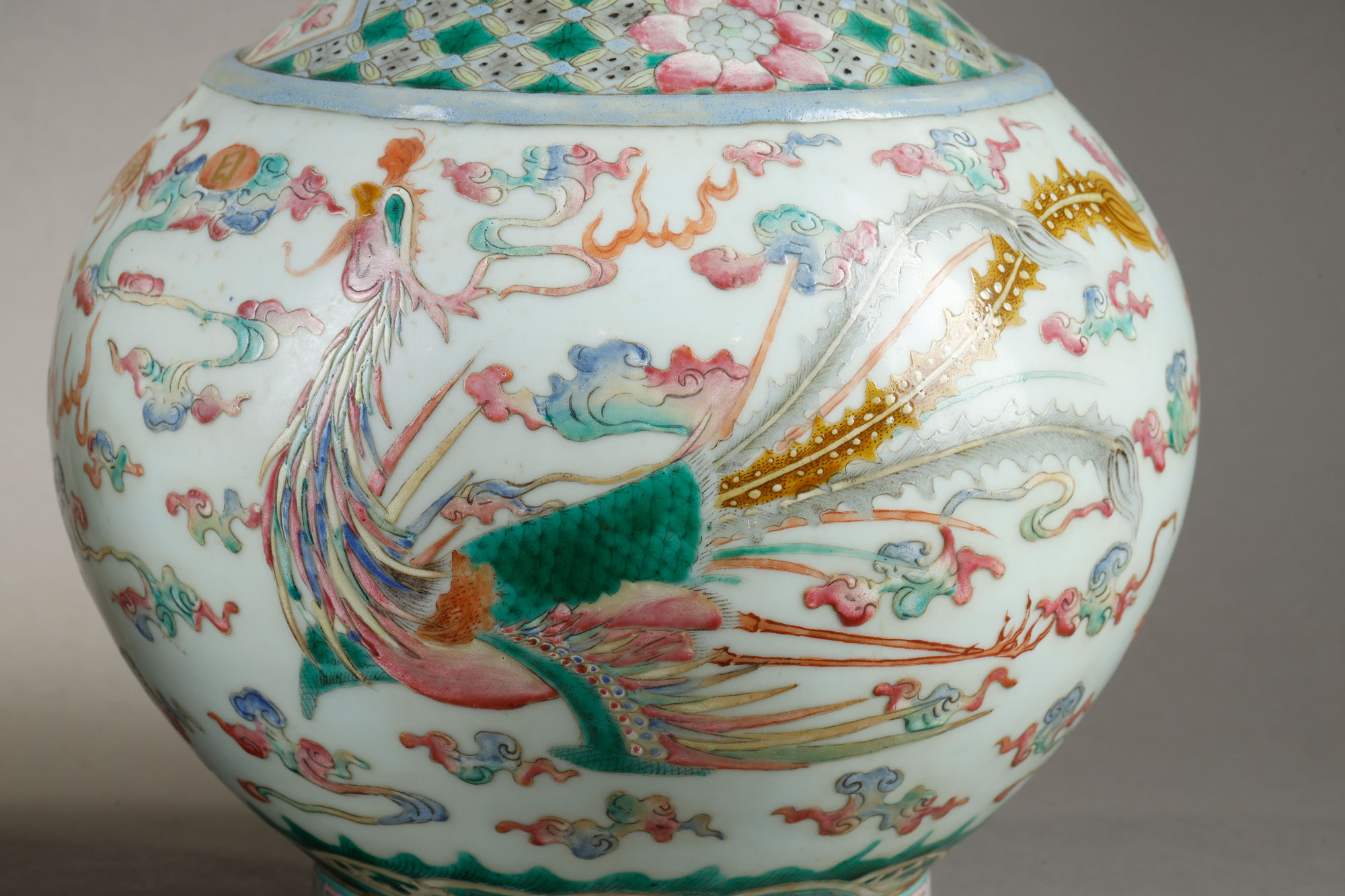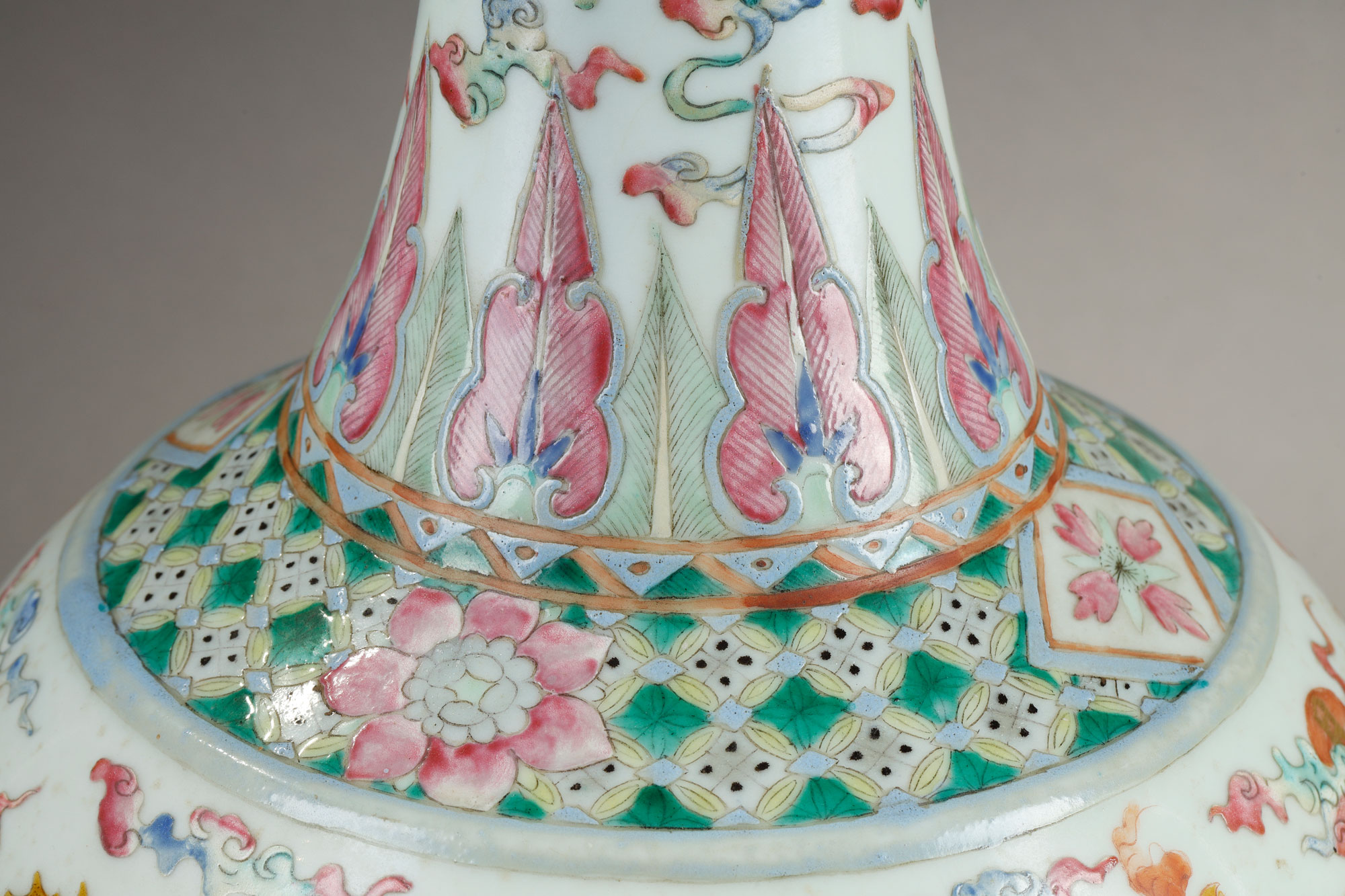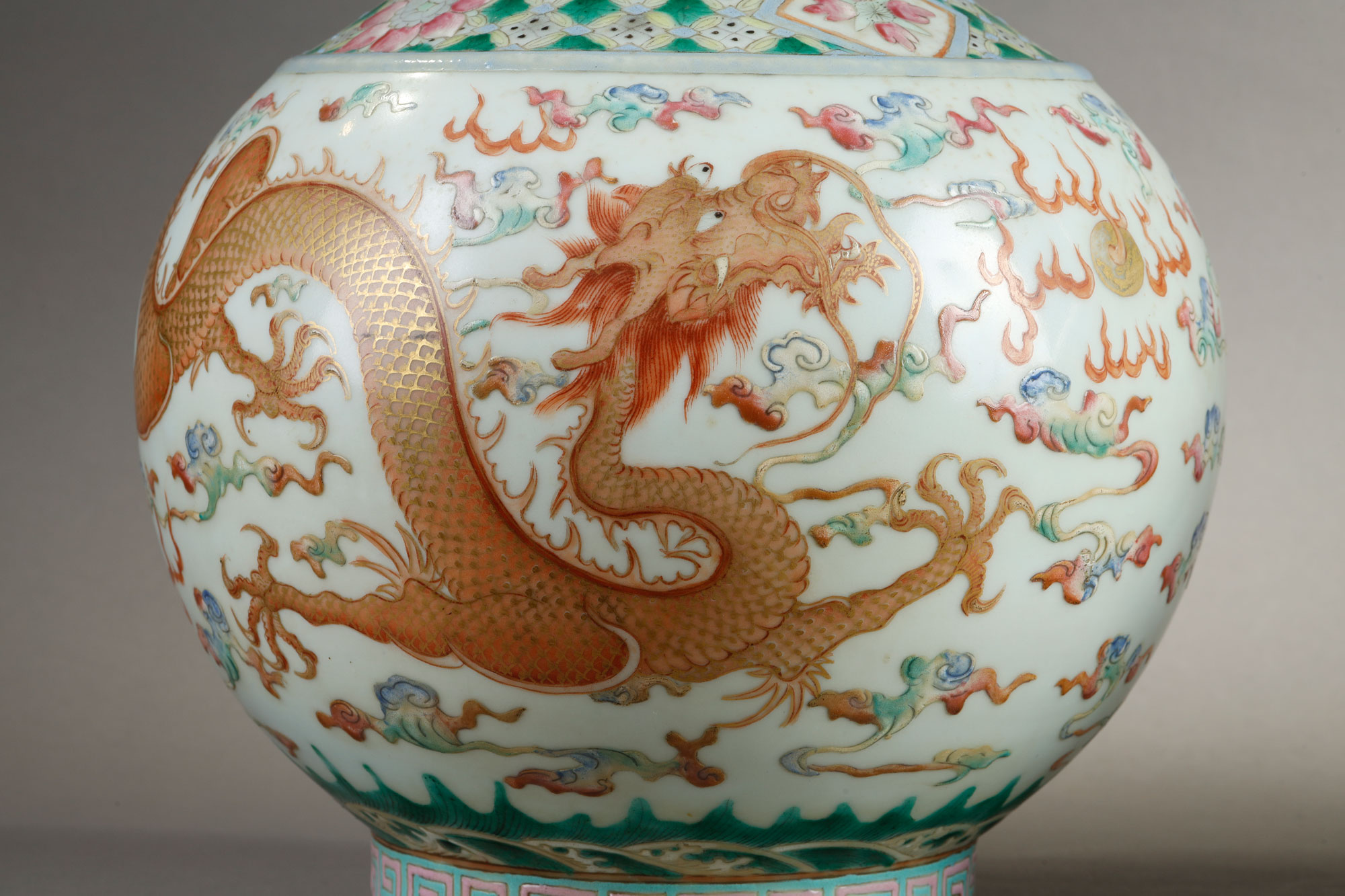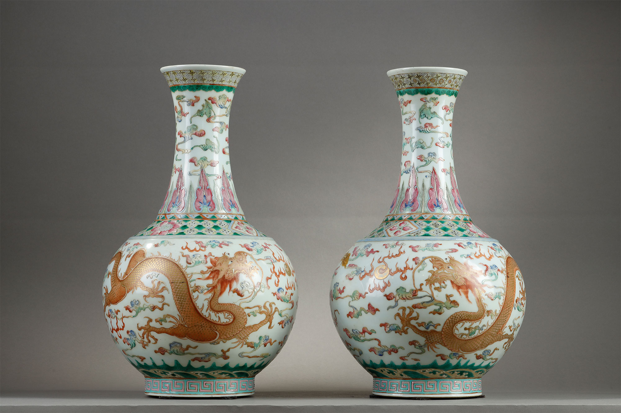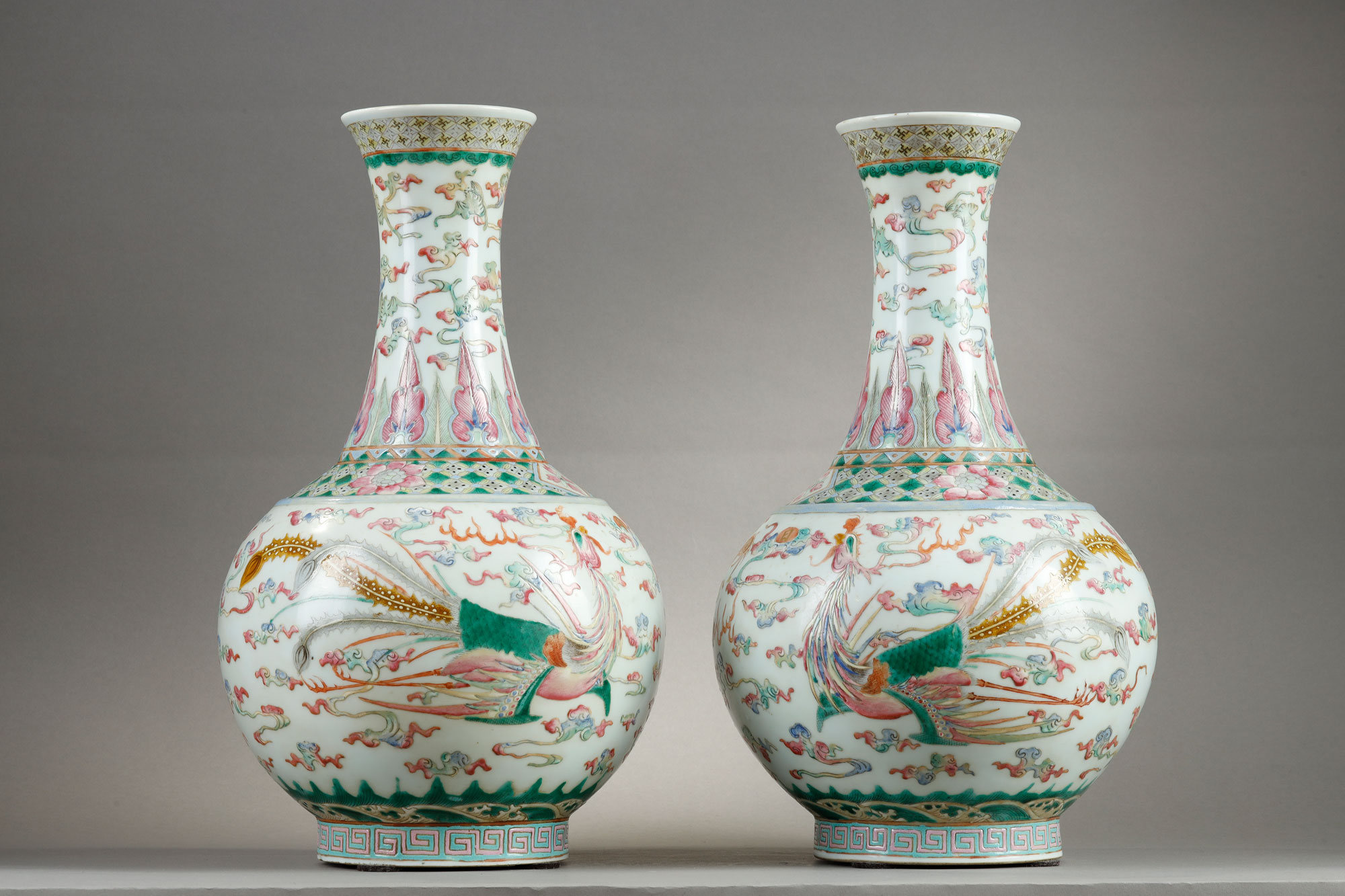 Pair of “shangping” vases, with bulbous bodies and flared necks, made of pink family porcelain. They are decorated with a phoenix in flight chasing the sun and a five-clawed dragon chasing a flaming pearl, both moving among flames and lingzhi-shaped clouds. The shoulder is decorated with a frieze of geometric patterns and flowers. The neck is decorated with stiff leaves, bats, and lingzhi-shaped clouds.