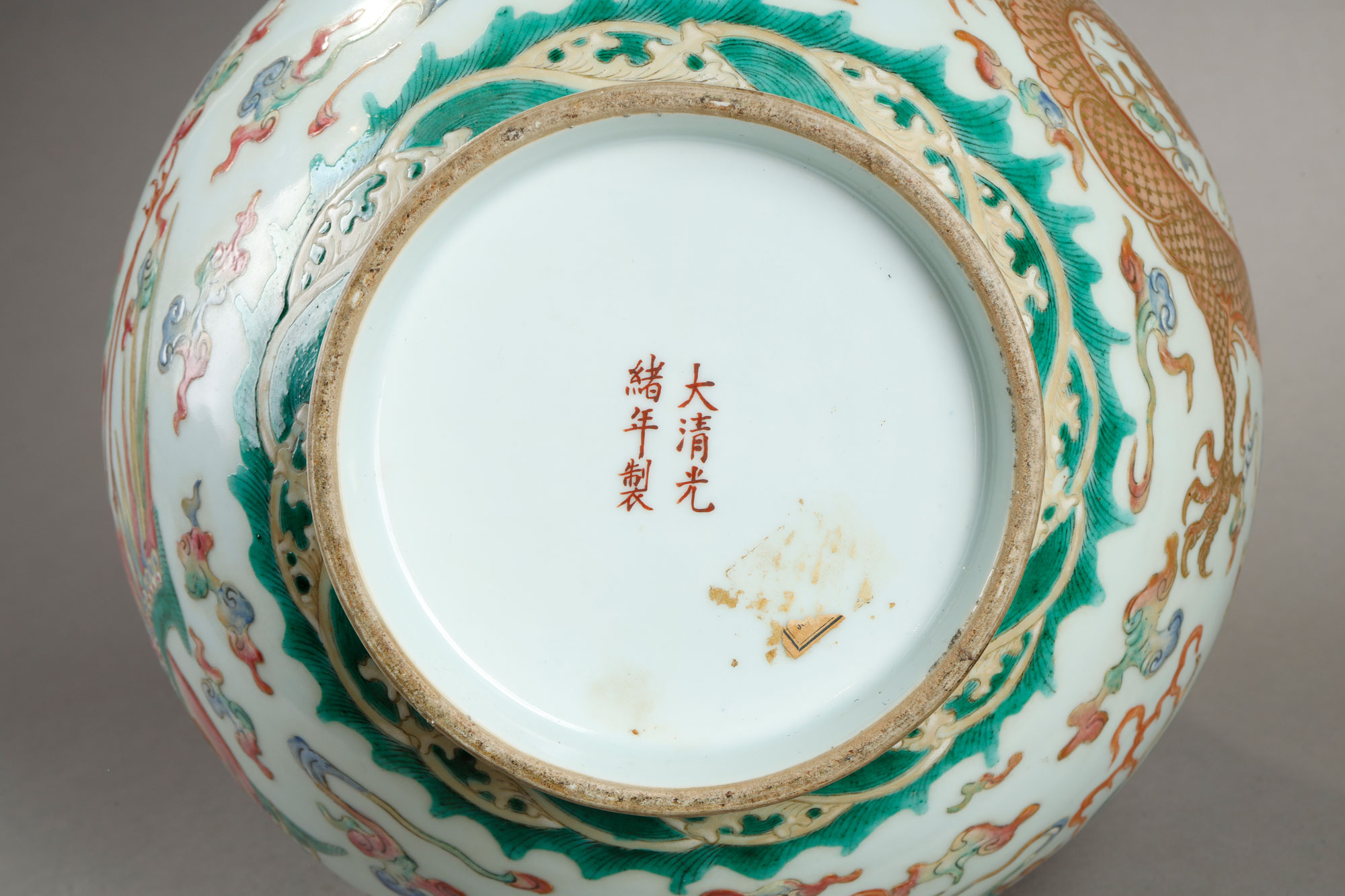 The dragon and phoenix motif is full of auspicious connotations. Vessels/objects decorated with two of the most important mythical animals in Chinese tradition were usually made as wedding gifts. The dragon is the symbol of the emperor and represents fertility, while the phoenix embodies the warmth of the sun and helps to produce male offspring. The dragon, along with the phoenix, which is also the leader of all winged creatures, symbolizes the emperor and empress, while representing marital happiness. When the two animals face each other, they convey the message of a happy and auspicious union.