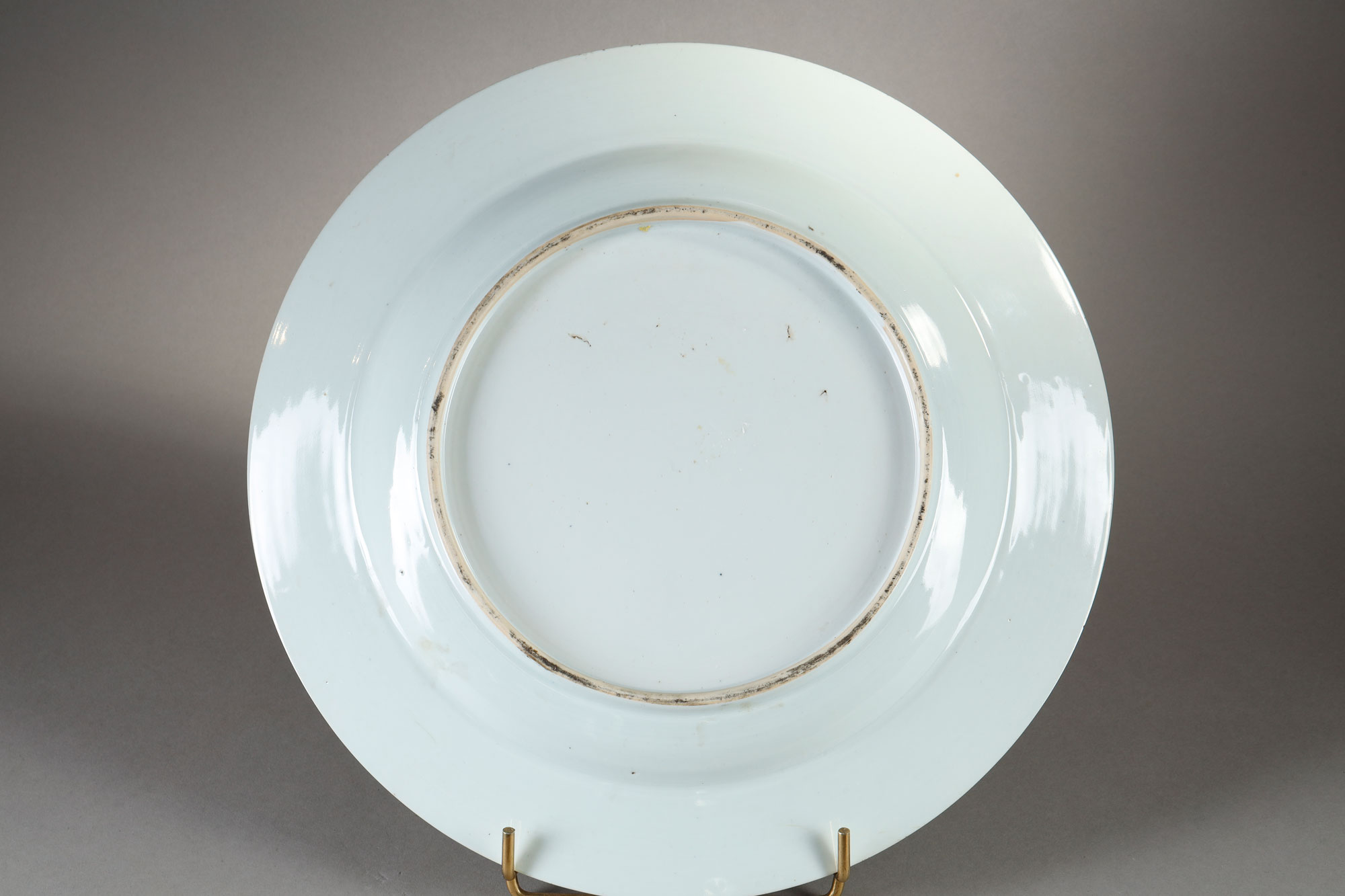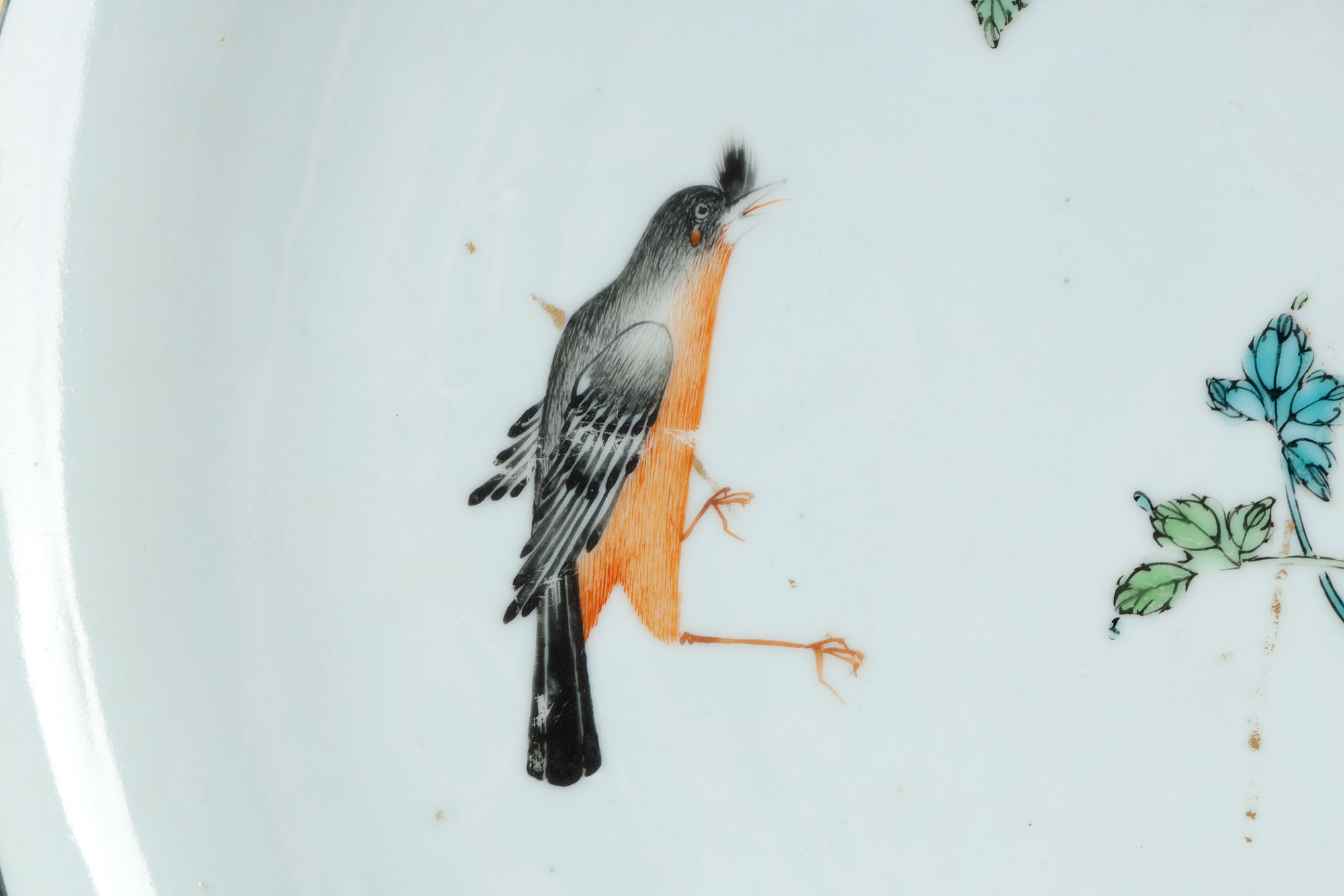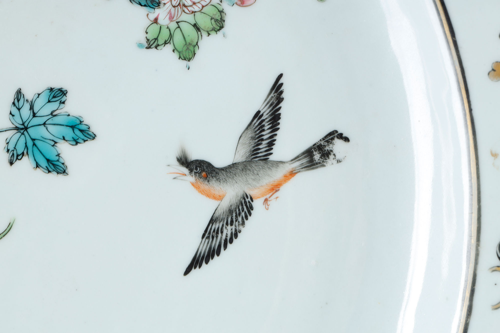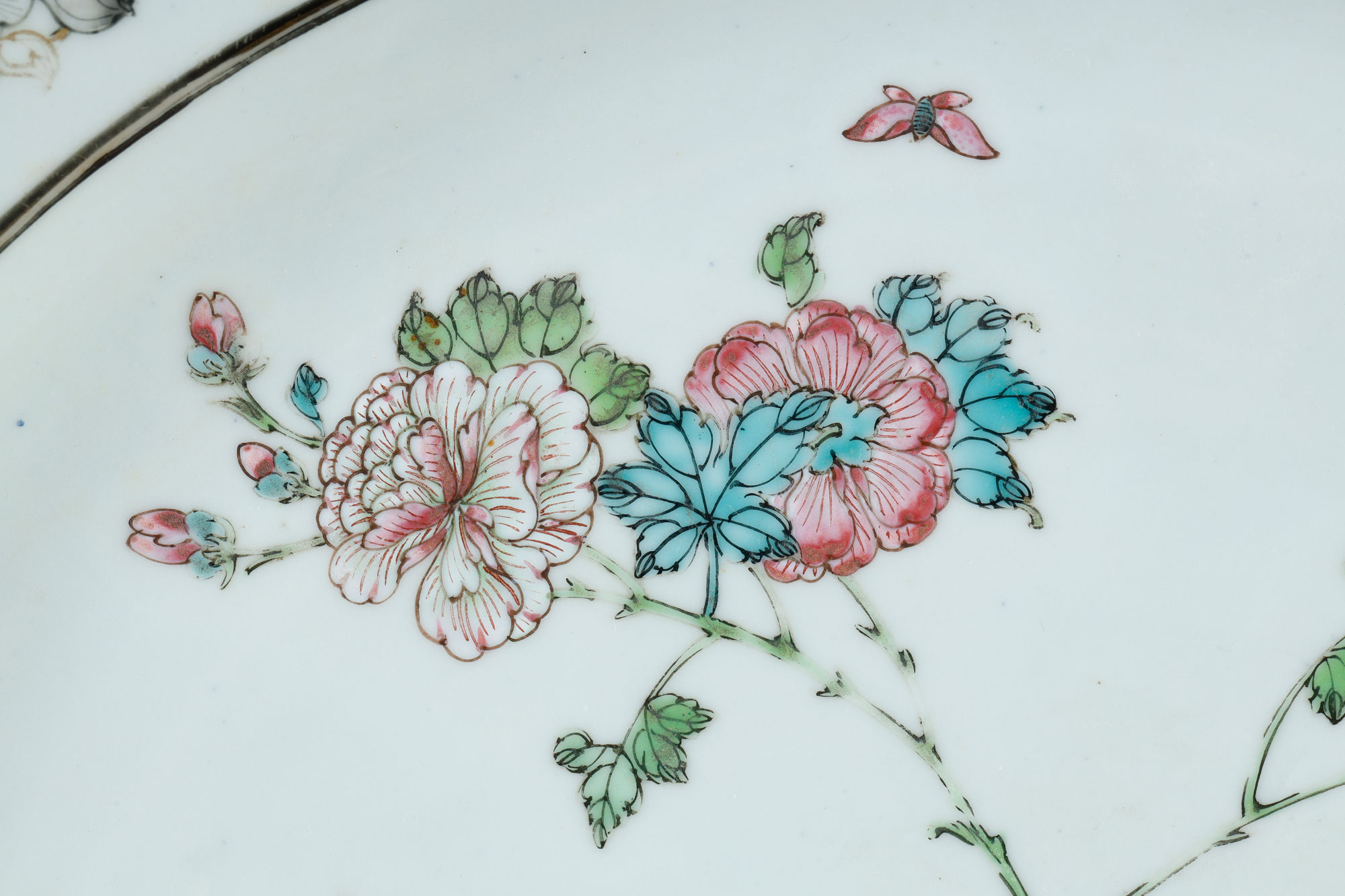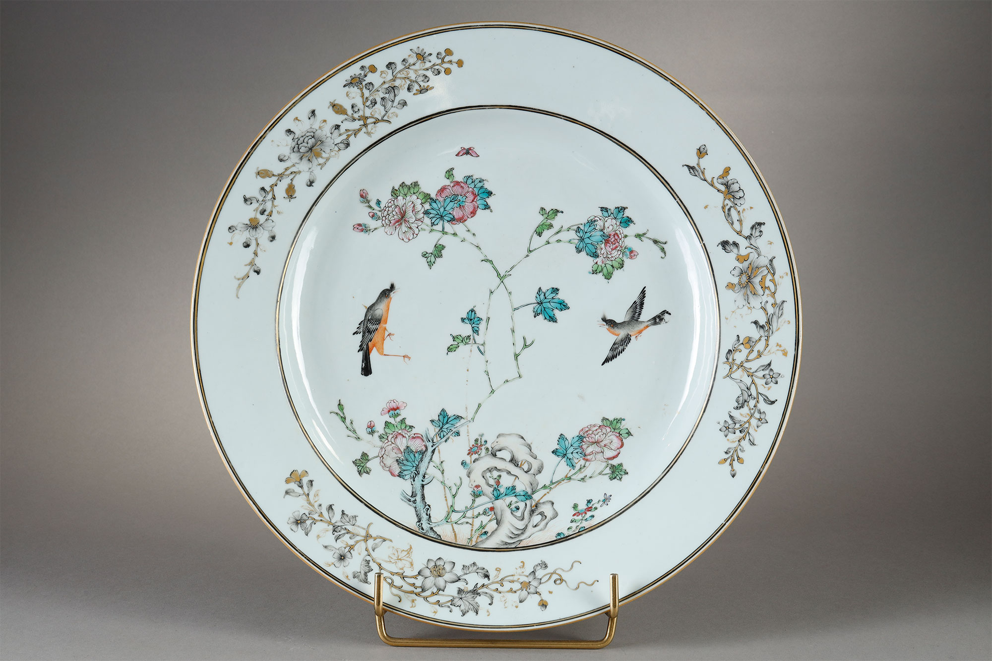 Porcelain dish decorated with “famille rose” enamels. The center is adorned with two birds, one perched on a branch, the other in flight, accompanied by butterflies among peonies. The rim is decorated with peonies in gray, gold, and black.