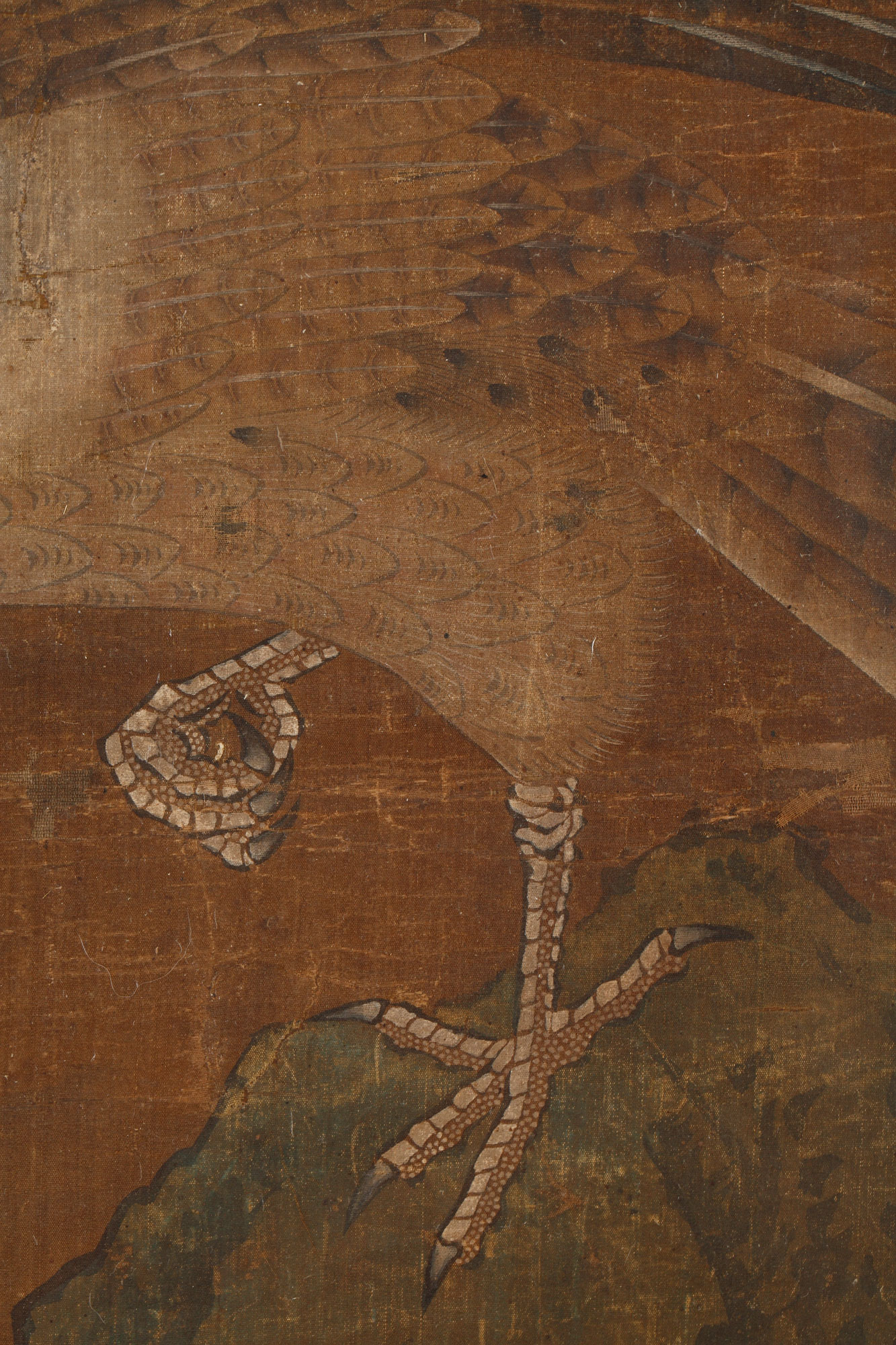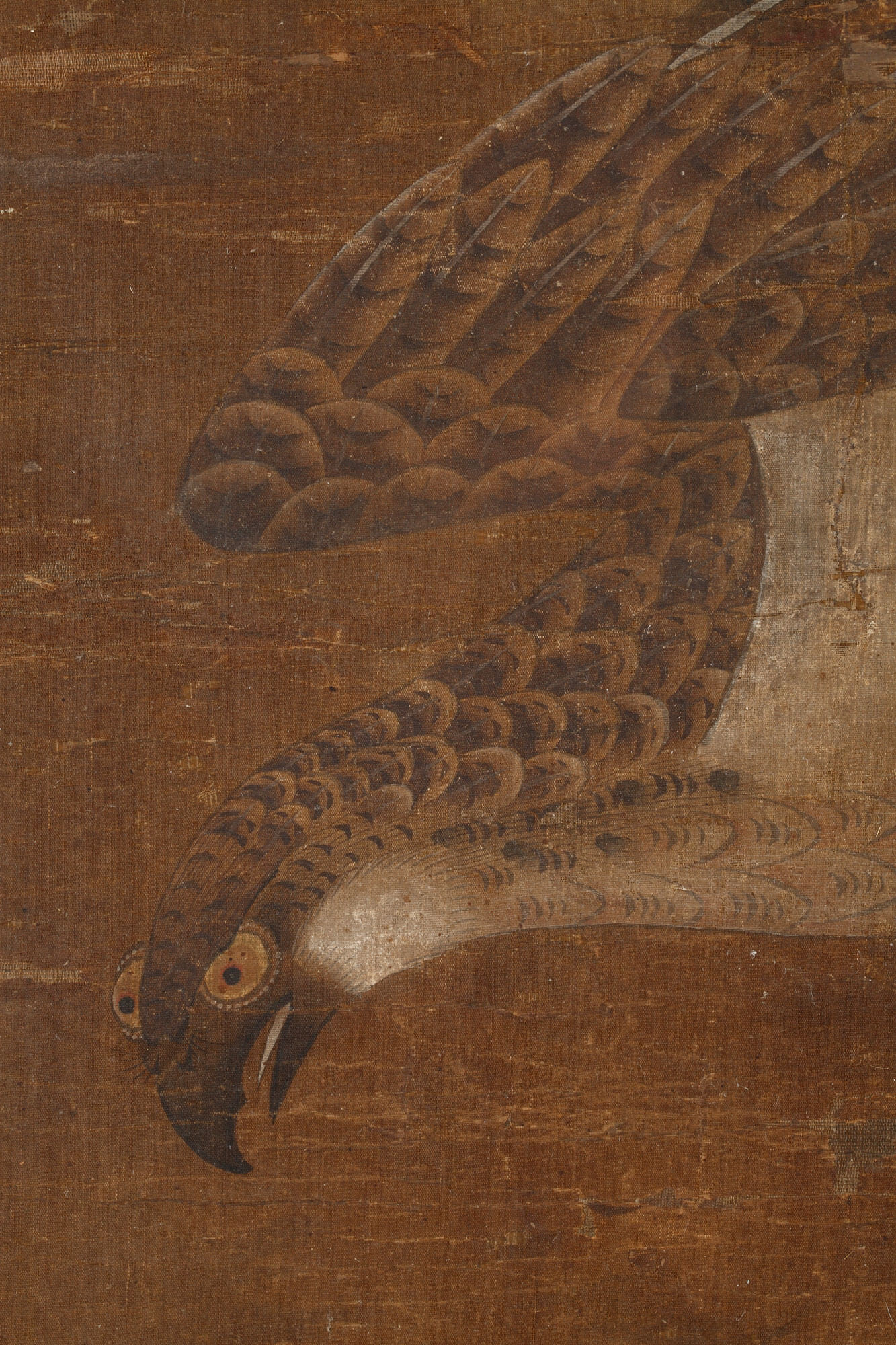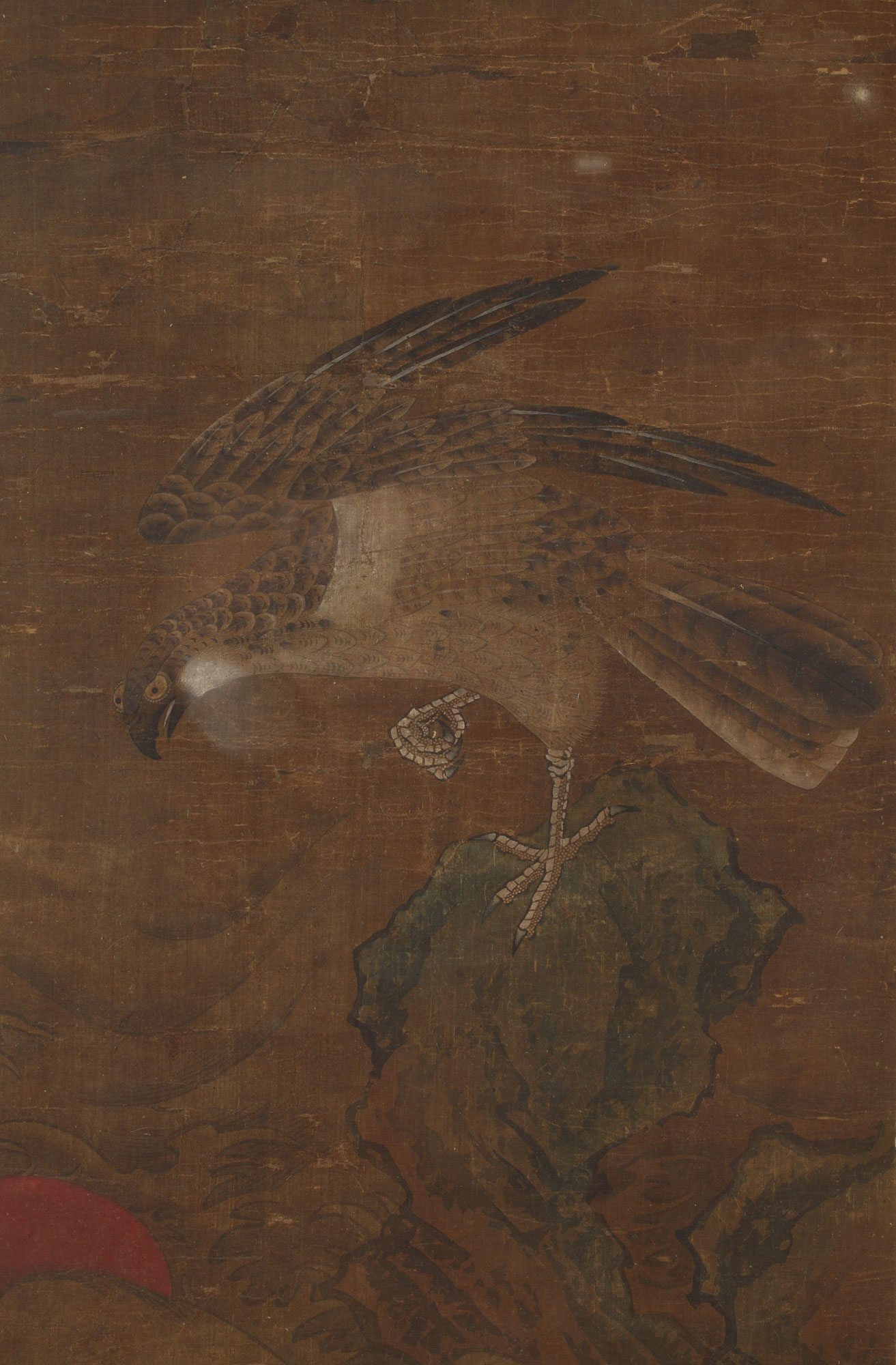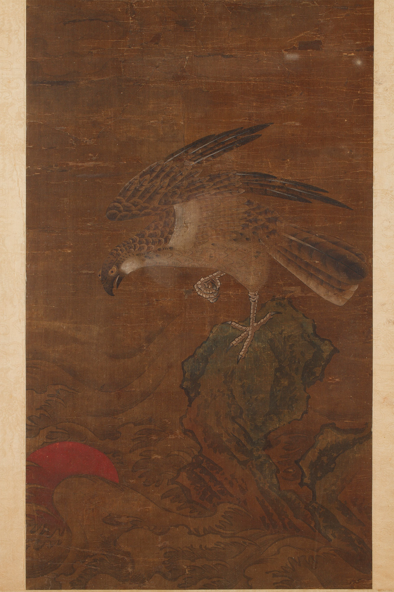 一幅鹰栖于岩石上的画作,采用墨色与多色绘于丝绸之上。