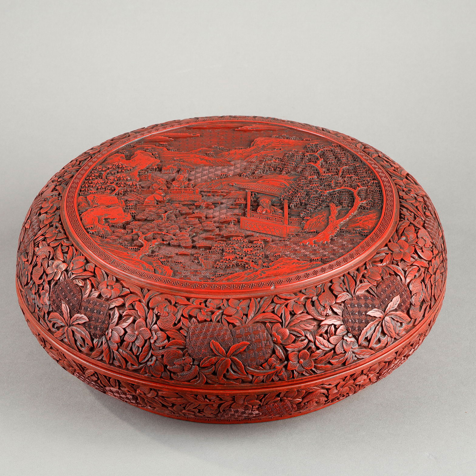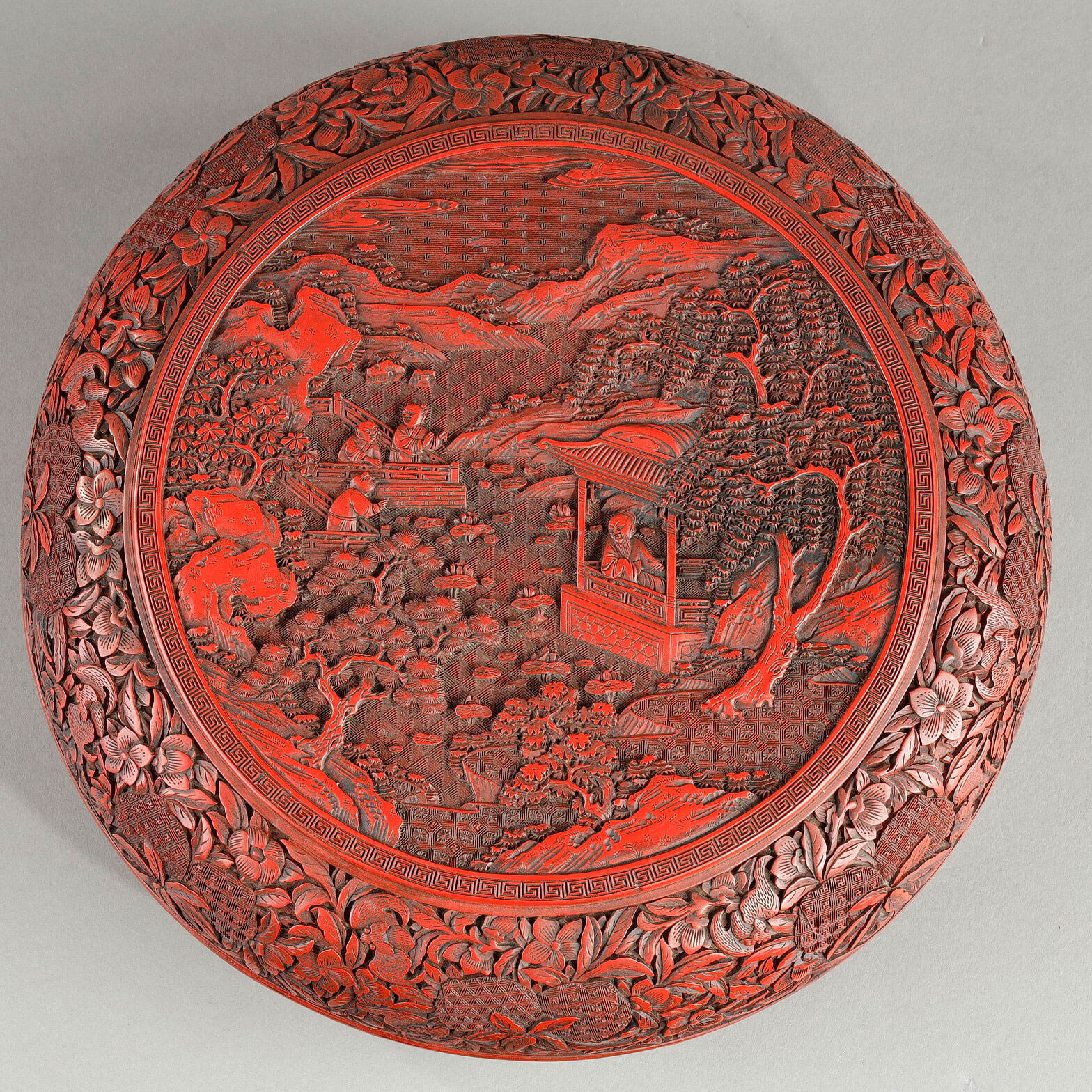 盖子中央饰有湖光山色图案:一位文人坐在敞开的亭中,凝望着由莲花、树木和岩石构成的景致。三位弟子站在突出的露台上,目光投向亭子,完成了盖子上的画面。