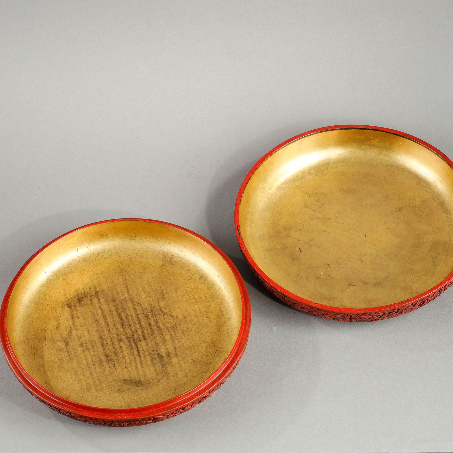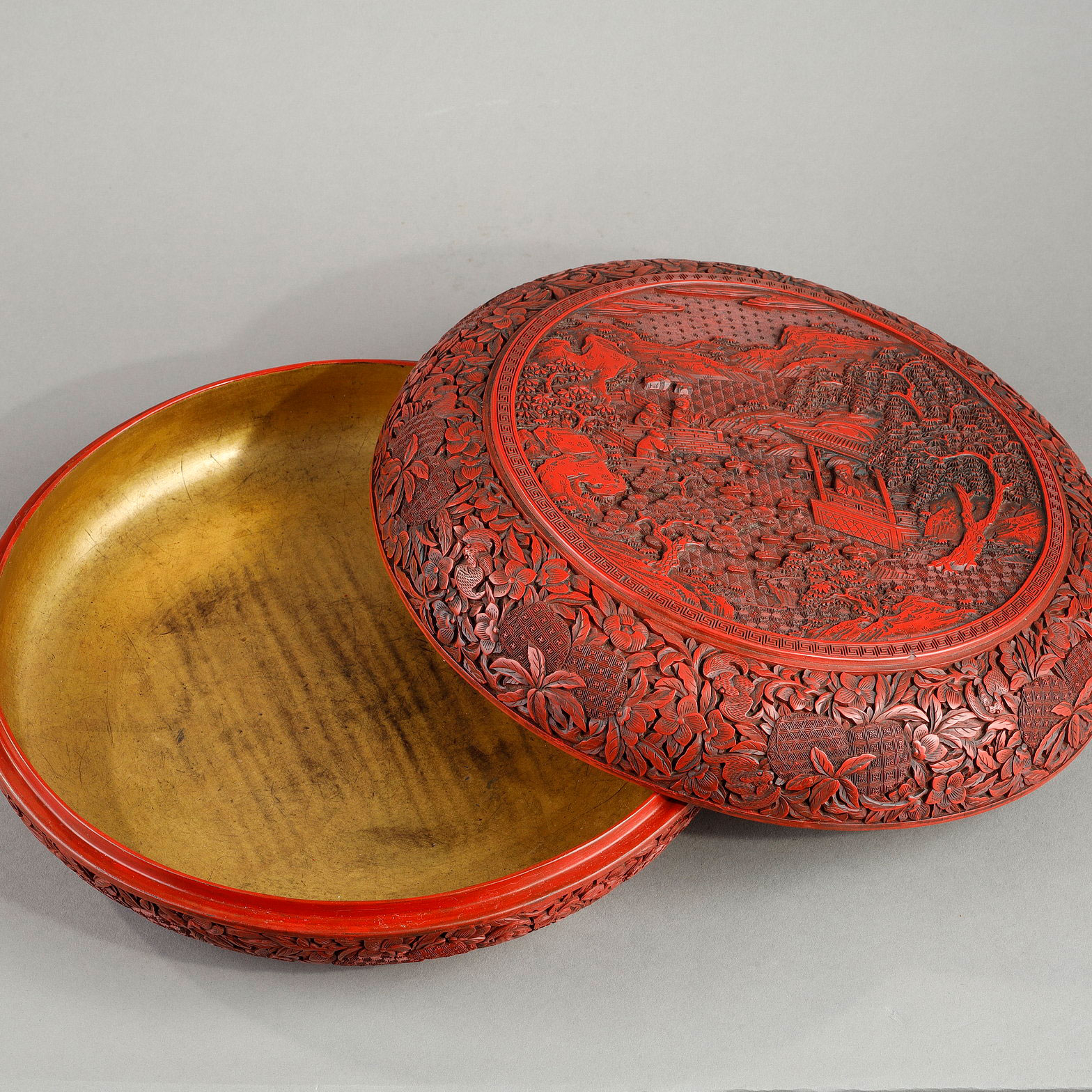 北京朱红漆圆盒,盒盖上以漆料为媒介,在漆层厚度上雕刻出人物图案,工艺精湛。