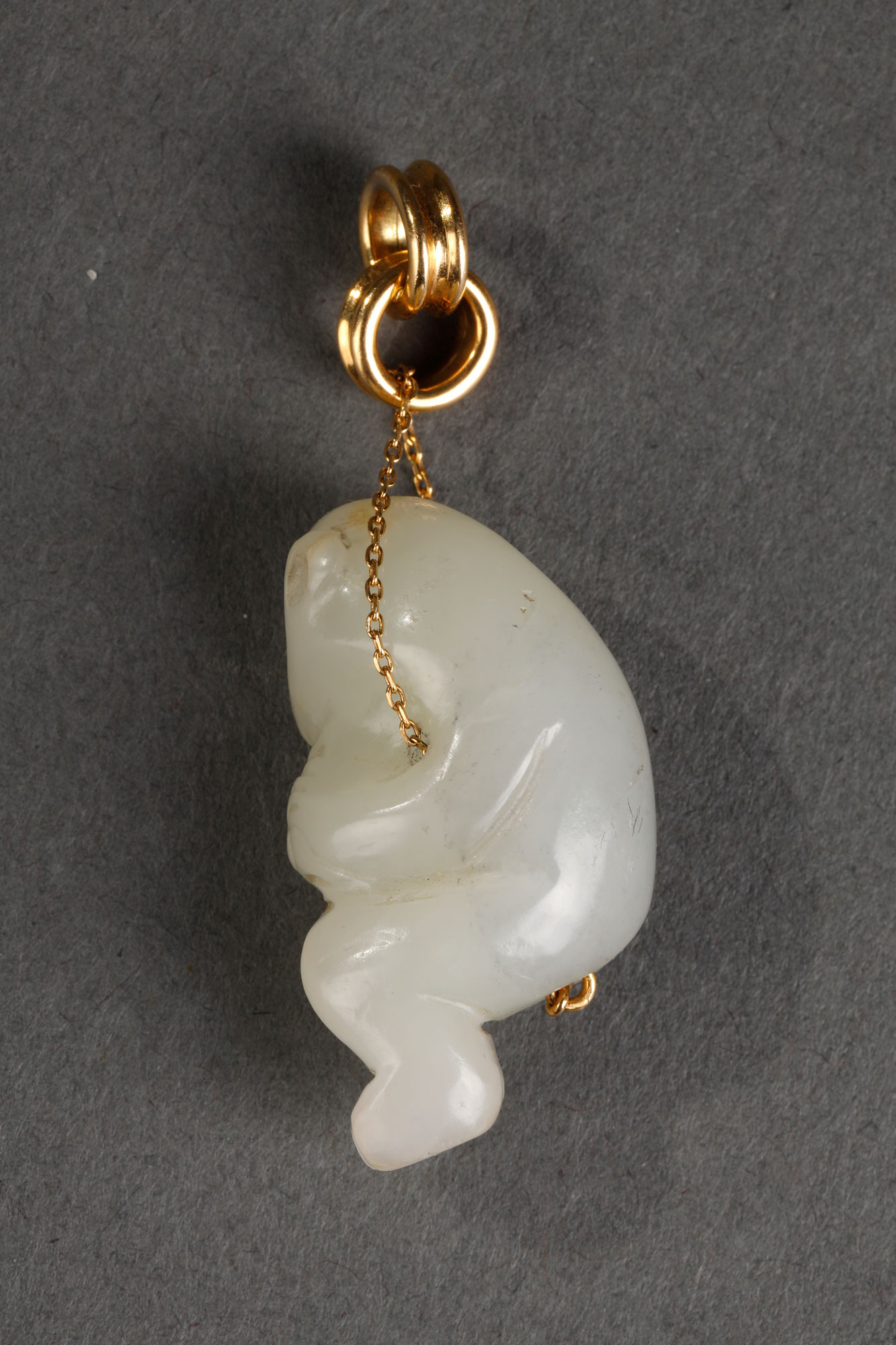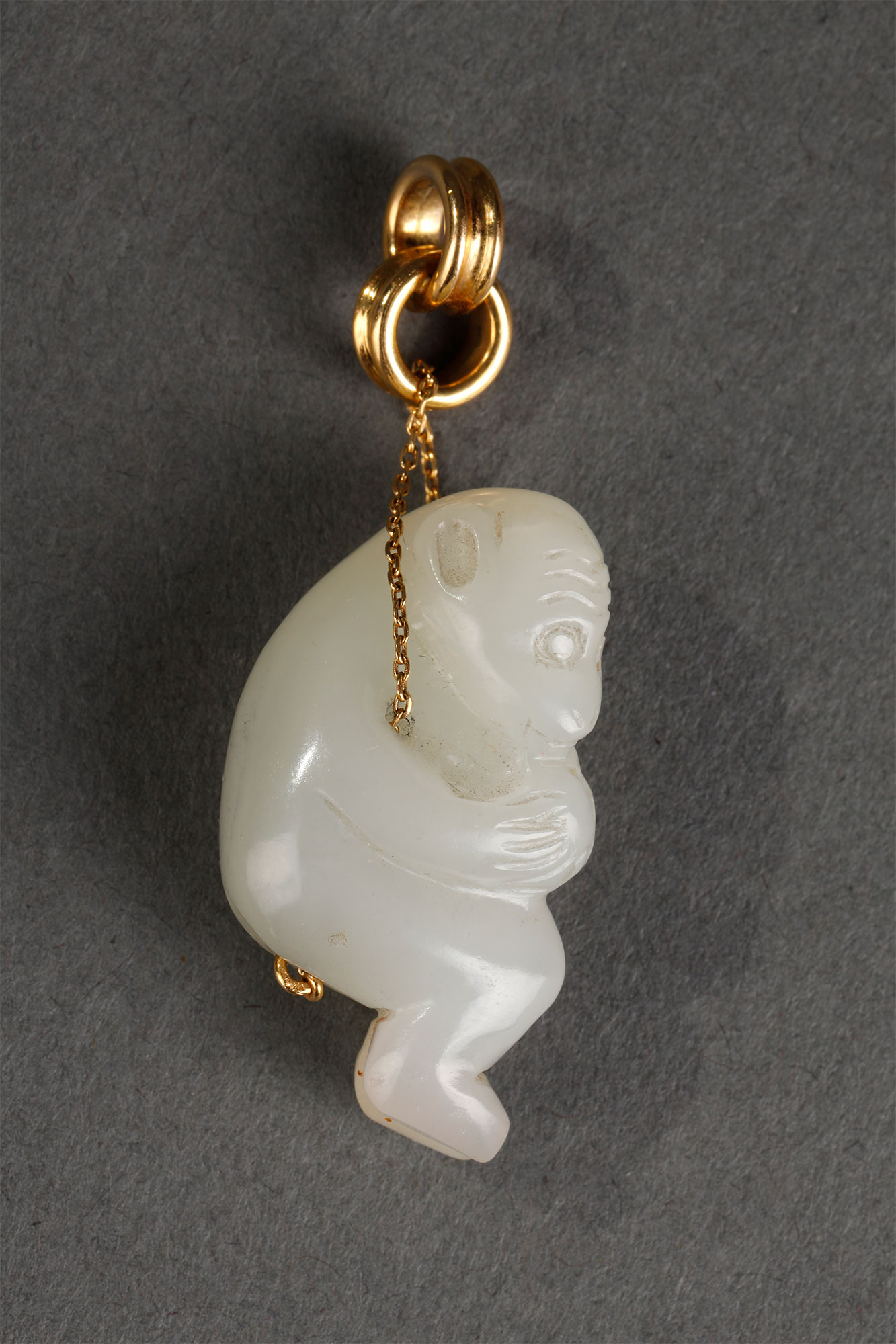 这枚吊坠以白玉雕刻而成,呈现一只猴子的形象。白玉因其纯净的色泽与光滑明亮的表面,在中国艺术中备受推崇。雕像悬挂于金质底座上,底座由环扣与细链组成。