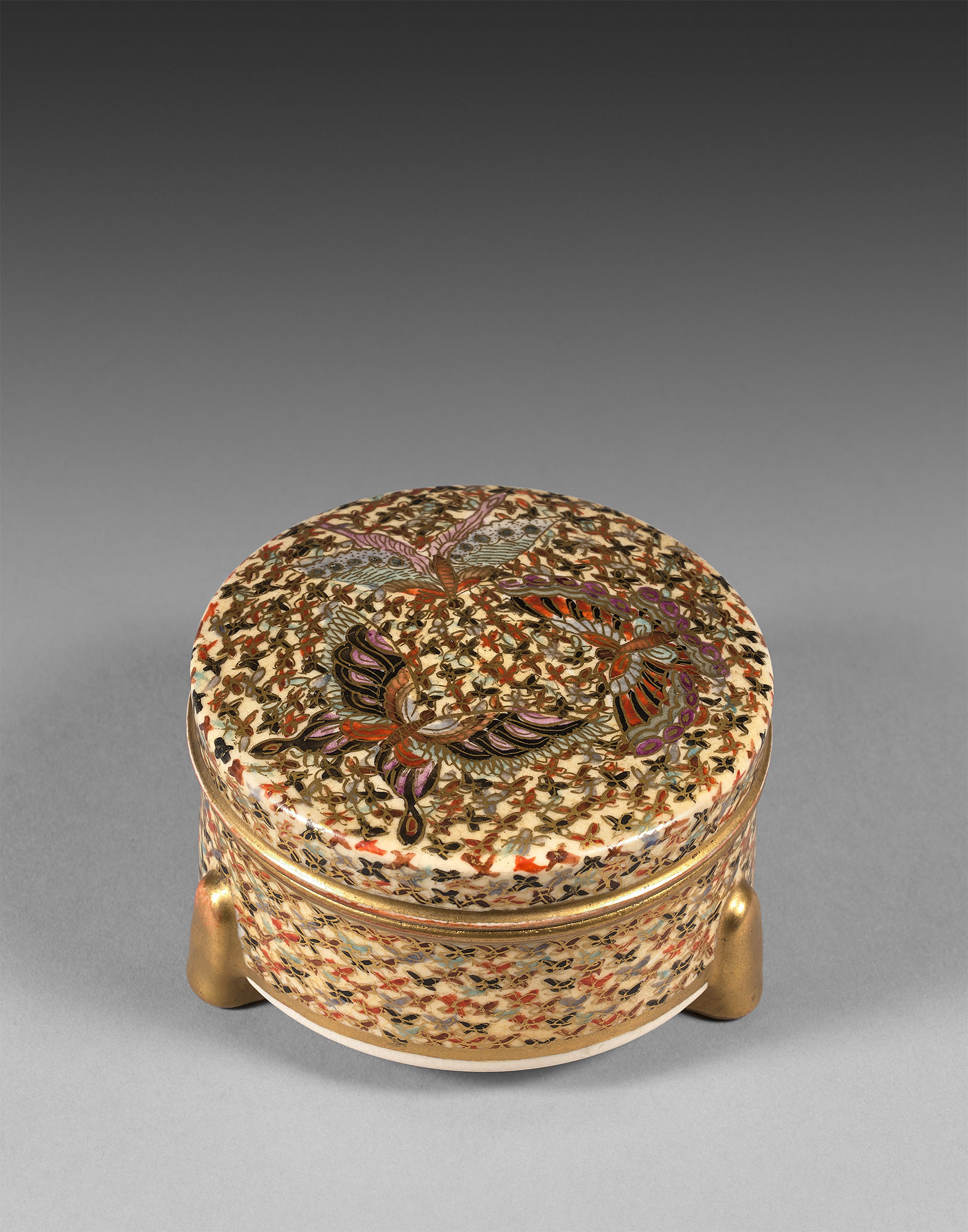 一只饰有蝴蝶图案的萨摩瓷三足小盒。