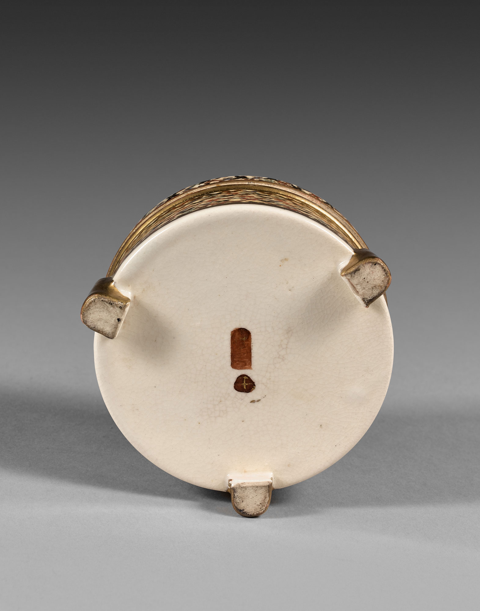 这款圆形盒子立于三个小脚上,表面通体饰有无数飞舞的小蝴蝶,采用红、绿、棕及金色的釉料绘制。盒盖上绘有三只飞舞的大蝴蝶,盒盖背面及盒内侧亦饰有相同图案。盒底釉上饰有红金双色的烙印。